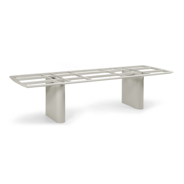 Das pulverbeschichtete Aluminiumgestell ist wahlweise in Eisengrau oder Dune erhältlich und überzeugt durch seine klare Linienführung. Die markanten zwei Säulen verleihen dem Tisch nicht nur Stabilität, sondern setzen zugleich ein architektonisches Designelement, das Leichtigkeit und Präsenz harmonisch verbindet.