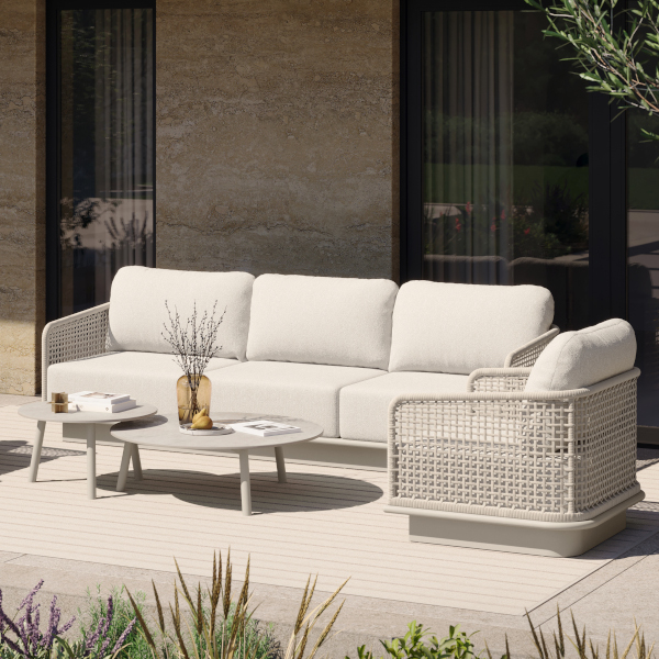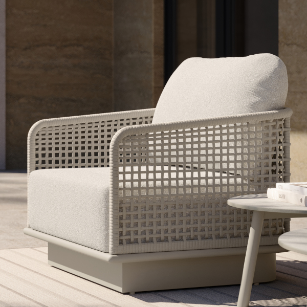 Das pulverbeschichtete Aluminium in der zeitlosen Farbe Dune bildet die stabile und langlebige Basis der Möbel. Rücken- und Sitzflächen sind mit einem hochwertigen Rope-Geflecht im Farbton Linnen ausgestattet. Die offene Flechtung sorgt für eine besondere Leichtigkeit und Transparenz, die der Lounge eine moderne, elegante Optik verleiht.