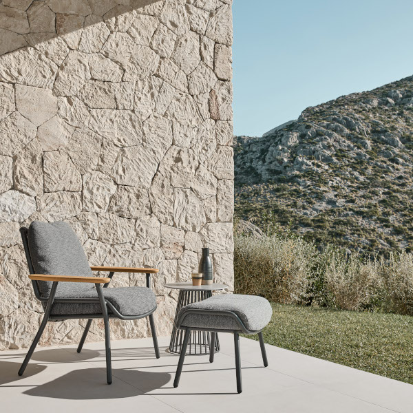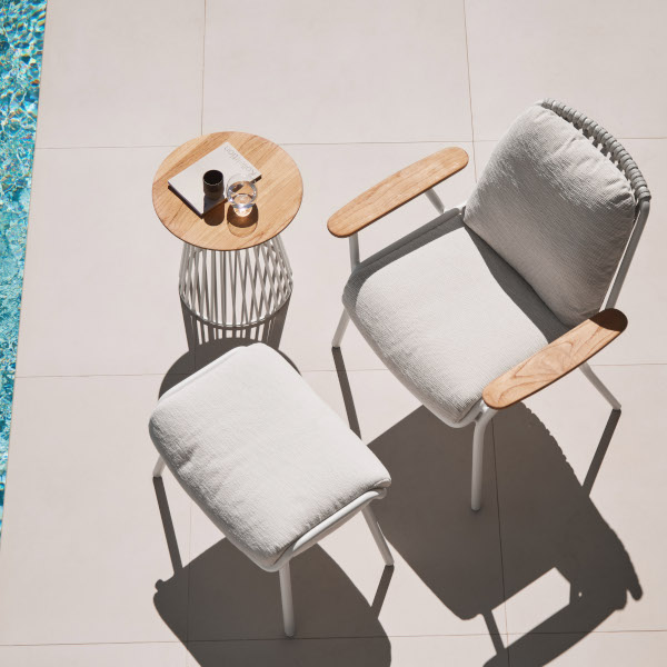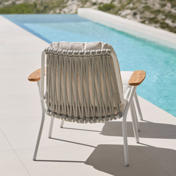 Die Armlehnen aus nachhaltigem Teakholz verleihen Basso nicht nur eine warme Note, sondern setzen auch ein Statement für Umweltbewusstsein und Stil.
