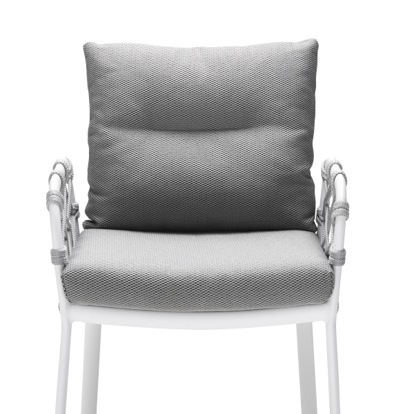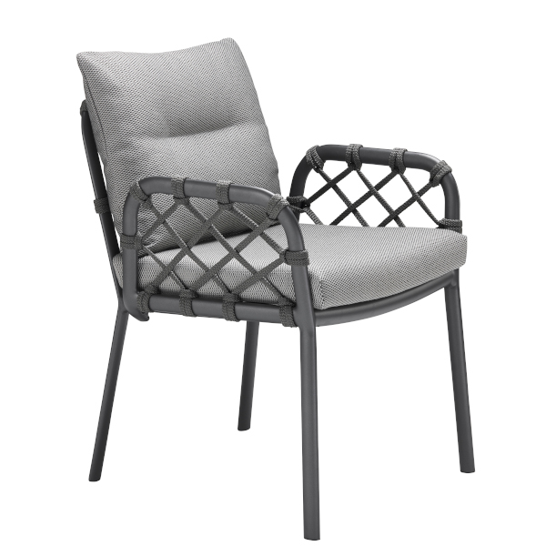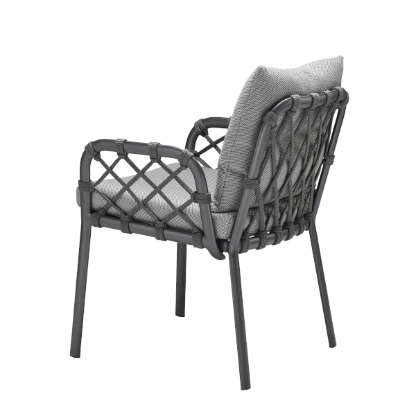 Der Diningsessel CARO besteht ebenso wie seine große Schwester aus einem filigranen Aluminium-Rahmen mit abgerundeter Silhouette mit dem typischen Rautengeflecht. Das weitmaschige String Flex ist natürlich wetterfest und UV-beständig.