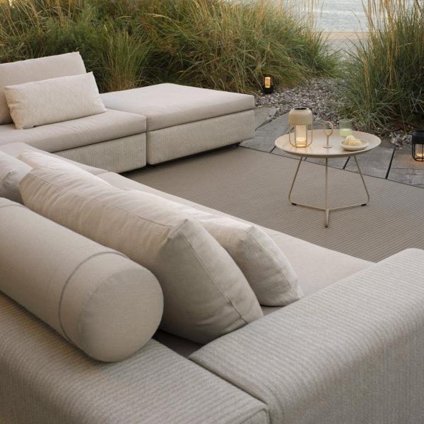 Die Drift Lounge vom Hersteller Houe bringt echtes Wohnzimmerfeeling auf die Terrasse. Das modulare Outdoor-Sofa lässt sich flexibel zusammenstellen – mit einem Eckmodul links oder rechts sowie einer Ottomane, ganz nach Wunsch und Platzangebot.