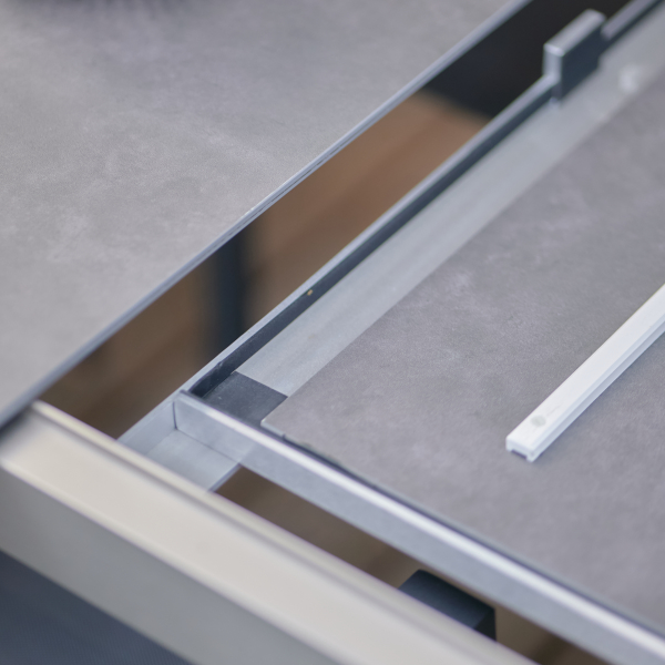 Das stabile Aluminiumgestell ist wahlweise in Eisengrau, Weiß oder Dune erhältlich und unterstreicht die klare, zeitgemäße Formensprache. Der Tisch ist in zwei praktischen Größen verfügbar: 160/220 × 90 cm sowie 220/280 × 100 cm. Dank des komfortablen Kopfauszugs lässt sich die Tischfläche nahtlos am Ende erweitern. Die Zusatzplatte wird platzsparend unterhalb der Hauptplatte verstaut und ist bei Bedarf schnell einsatzbereit.