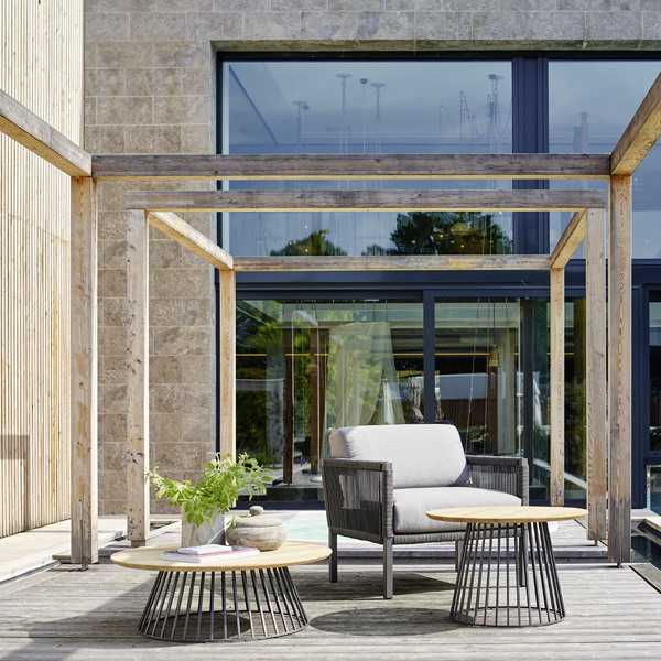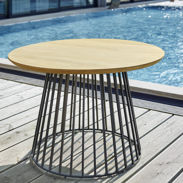 Durch den besonderen Schliff wirkt die Tischplatte von Grid leicht, fast schwebend auf dem Aluminium-Gestell und lässt die eigentliche Stärke des Teakholzes fast nicht erahnen. Die Tische gibt es in unterschiedlichen Größen.