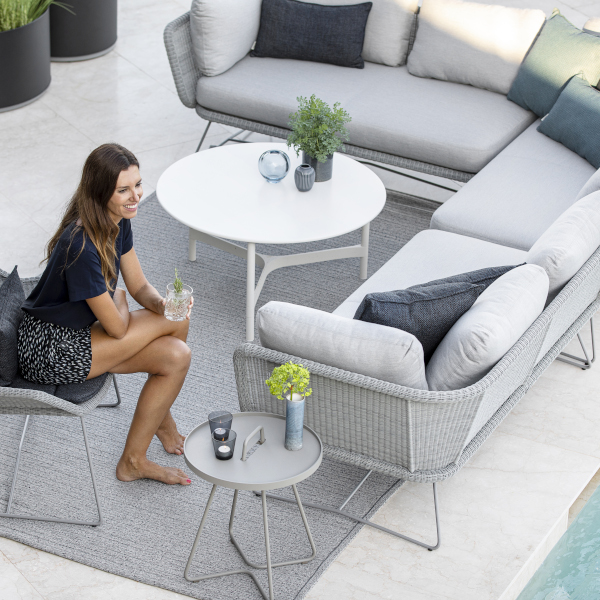 Horizon kann nämlich sowohl als Einzelmodul, sowie auch als Eck- oder U-Sofa angewandt werden. Der schmale Stahlrahmen verleiht der Lounge einen leicht schwebenden Ausdruck, der zusammen mit dem geflochtenen Sitz eine einzigartige Atmosphäre schafft. Sitz und Kissen sind aus dem weichen und bequemen Cane-Line Natté Stoff gefertigt, der Horizon zu dem perfekten Ort für Entspannung macht.