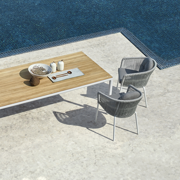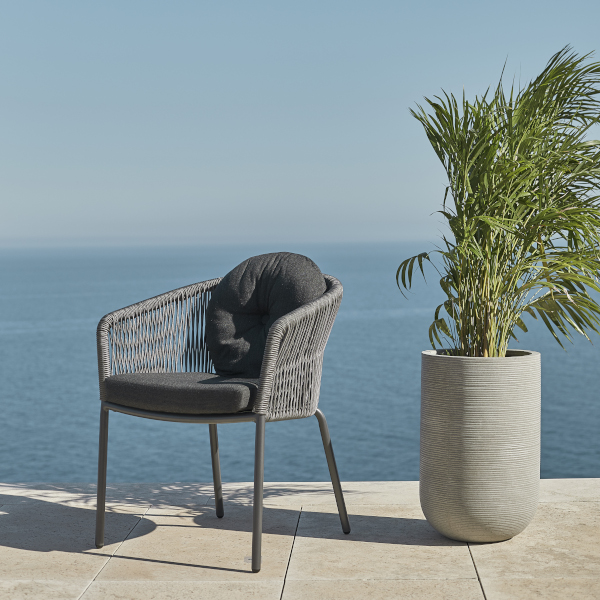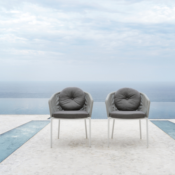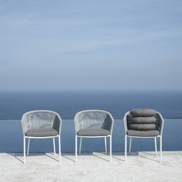 Natürlich sind die Kissen wetterfest und witterungsbeständig. Erhältlich ist der LOOP Diningsessel in den beiden Farbvarianten Anthracite und White/Grey mit farblich auf die Rahmenfarben abgestimmten Kissen wahlweise in rund oder eckig.