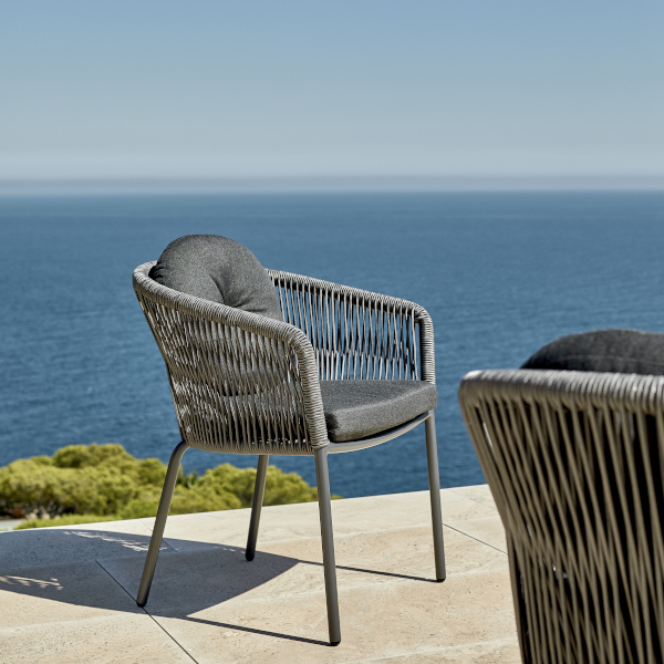 Die fließende Formgebung besticht durch das leicht transparente Seilgeflecht aus String Flex. Das mitgelieferte Rückenkissen gibt es wahlweise in quadratisch oder rund, was dem Sessel einen leicht romantischen Touch verleiht.