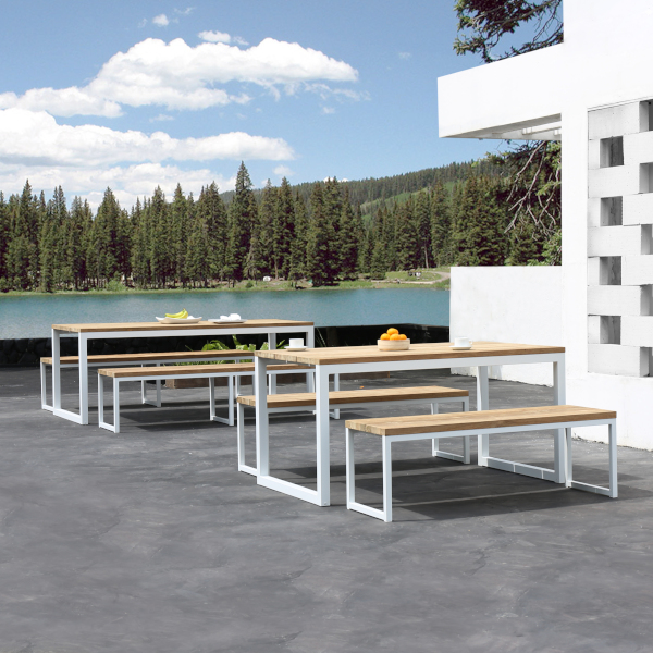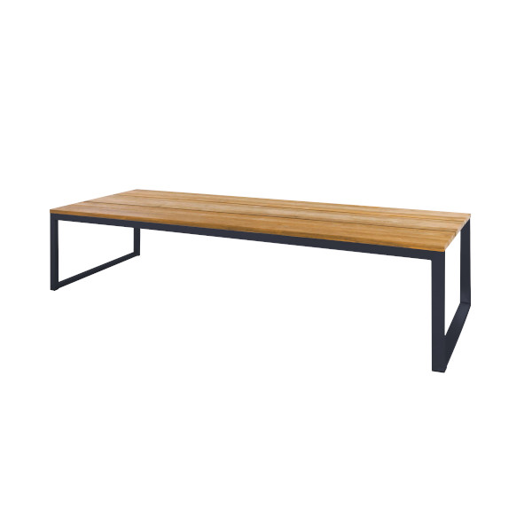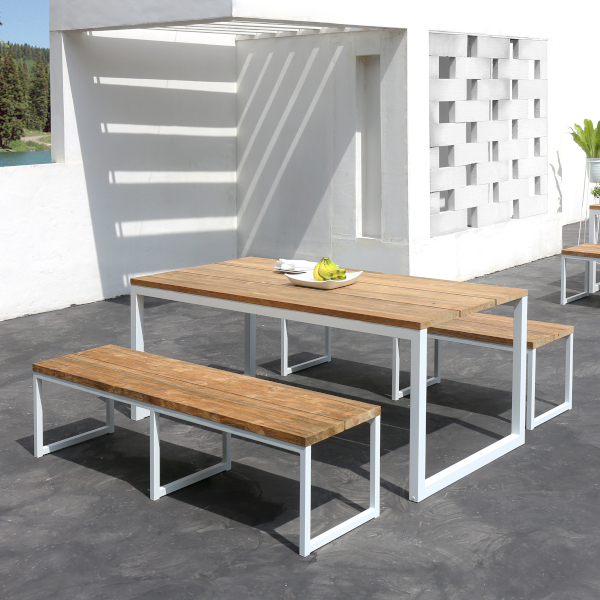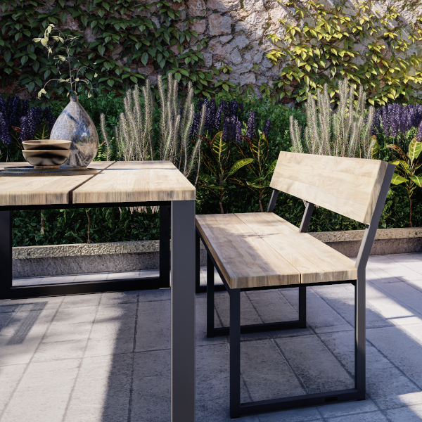Die neuen pulverbeschichteten Aluminiumgestelle in Graphit oder Weiß sind sowohl super robust als auch extrem pflegeleicht. Sie bieten der Tischplatte aus recyceltem Teakholz einen perfekten Rahmen und machen das Gesamtbild komplett. Mit der Zeit bildet das Teakholz die typisch silbergraue Patina, die den Kontrast zum Gestell noch einmal verstärkt und besonders edel aussieht.