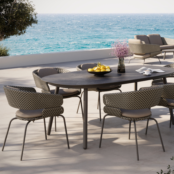 Sitz- und Rückenfläche sind mit einem robusten Kunststoffgeflecht im Farbton Soft Slate bespannt, das nicht nur optisch Akzente setzt, sondern auch besonders pflegeleicht und UV-beständig ist. Dadurch eignet sich der Sessel ideal für den Außenbereich und bleibt auch bei intensiver Sonneneinstrahlung form- und farbstabil.