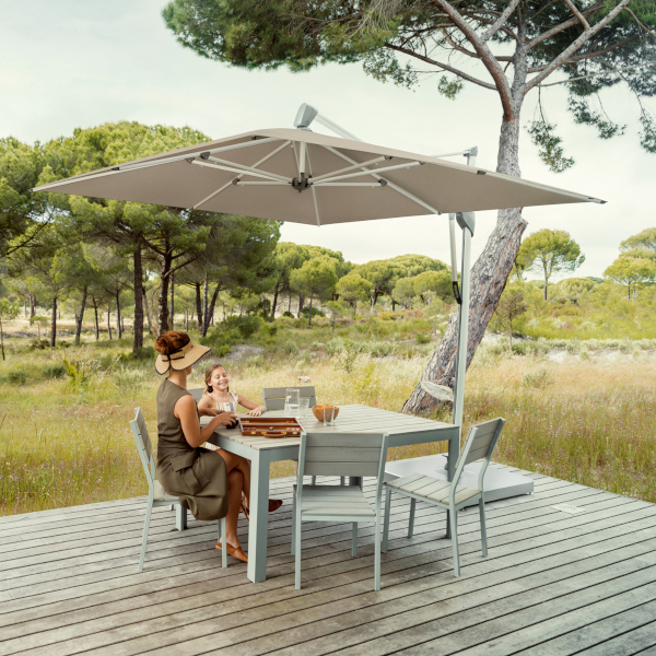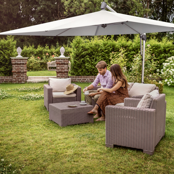 Dank des Schirmdaches, welches am seitlichen Mast befestigt ist, können alle Sitzplätze vollständig genutzt werden. Seine Technik in Kombination mit einfachster Handhabung und hochwertigsten Materials lassen Ihn schon bald zum Mittelpunkt jeden Gartens werden.