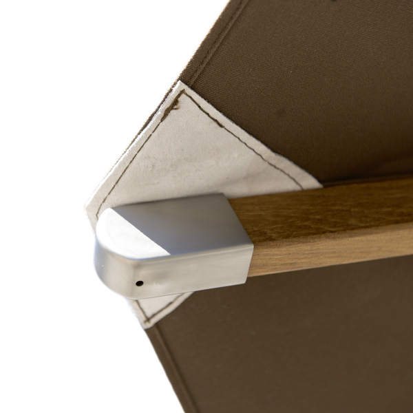 Der Holzsonnenschirm besticht durch seine hochwertigen Materialien wie naturbelassenes Teakholz, doppelter Flaschenzug, rostfreie Beschläge und mit Leder versehene Stoffecken.